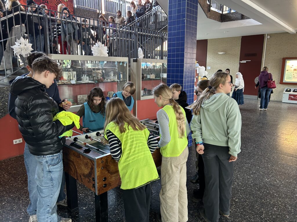 Kreativ wurde es ebenfalls: Die Klasse 10 SF organisierte einen Basteltisch mit Haargummibändern, an dem alle SchülerInnen ihrer Kreativität freien Lauf lassen konnten und bunte Armbänder gestalteten. Sportlich und spielerisch ging es beim Tischkicker-Turnier zu.