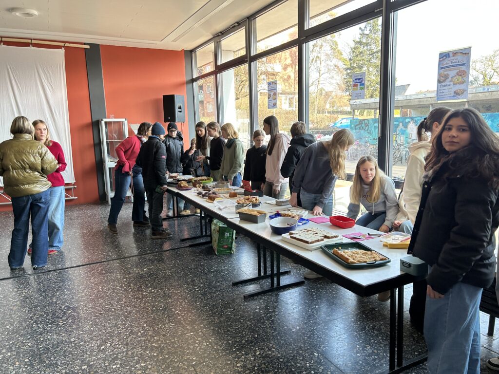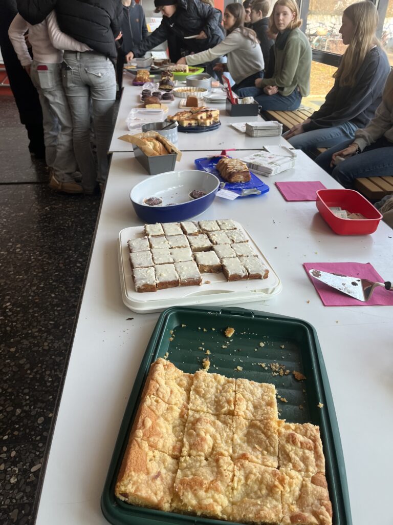 In der Osthalle gab es einen Crêpe- und Kuchenverkauf von Kursen der Jahrgänge 7, 8 und 9, der bei den SchülerInnen besonders gut ankam. Das Angebot enthielt viele typische französische Köstlichkeiten wie Apfeltarte, Madeleines und Crêpes, aber auch Muffins und Schokokuchen. Die Einnahmen werden für einen guten Zweck verwendet: sie gehen jeweils zur Hälfte an die Kinderrechtsorganisation Terre des hommes und die Hilfsorganisation Ärzte ohne Grenzen.