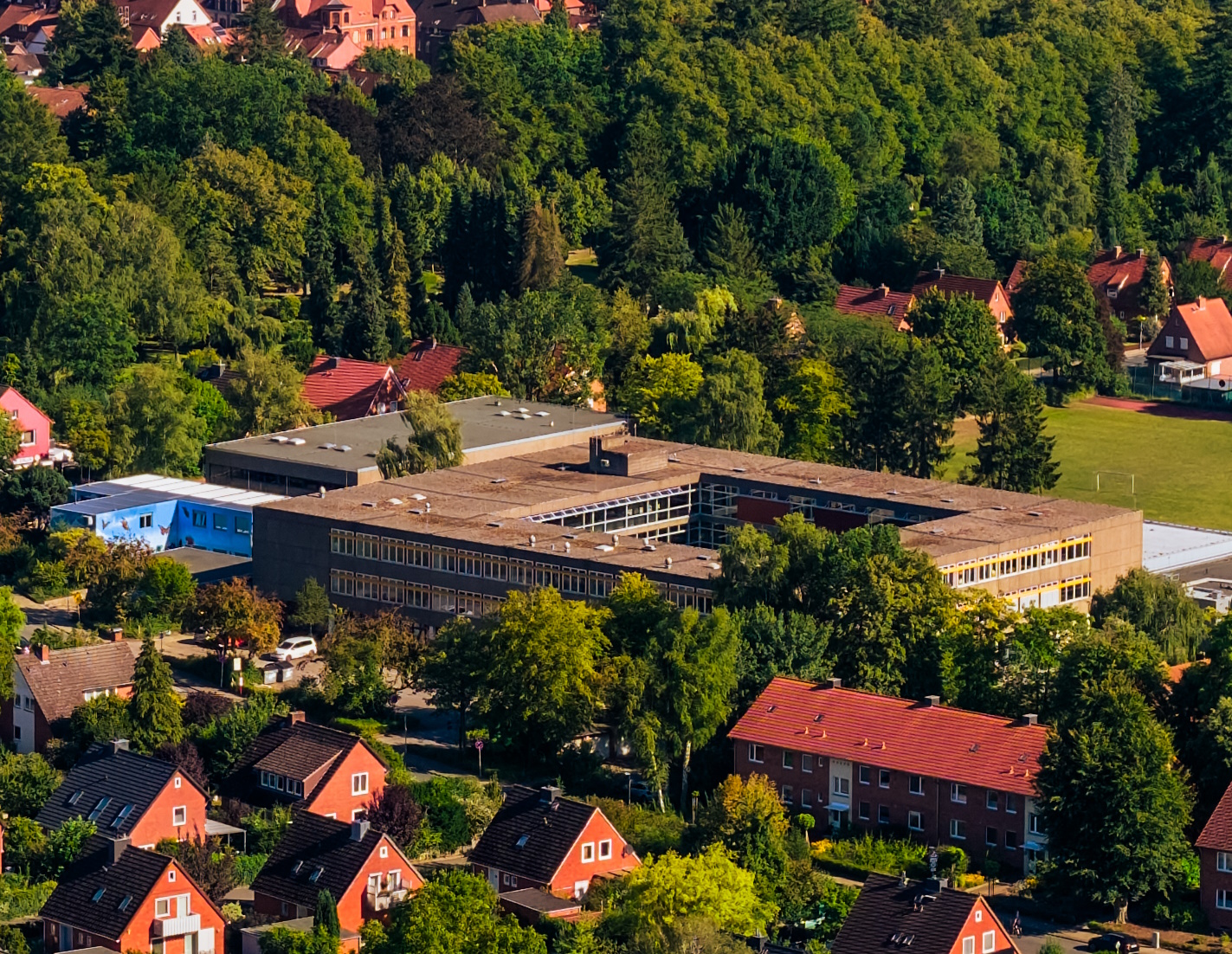 Zum Schul-Jubiläum hat Oberbürgermeisterin Claudia Kalisch ein besonderes Geschenk für alle Freunde der Herderschule: Eine Luftaufnahme des Schulkomplexes vor dem Panorama der Hansestadt.
