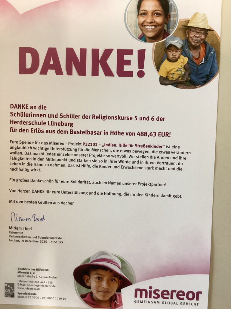 Die Schülerinnen und Schüler aus dem Jahrgang 5 und 6 verkauften im Dezember Selbstgebasteltes, das im Religionsunterricht hergestellt worden war. Daneben gab es auch eine Tombola, Witz“kekse“ und als lustige Aktion das Armdrücken. Auch einige Spenden haben fleißige Sammler/innen gesammelt. Der Erlös ging an ein Spendenprojekt von Misereor für ein Projekt in Indien, das Kindern in Armut hilft. Dieses Mal war die Spende sehr hoch: 488,63 Euro. Großartig! Wir danken allen, die den Basar vorbereitet haben, und den Käufern und Käuferinnen.