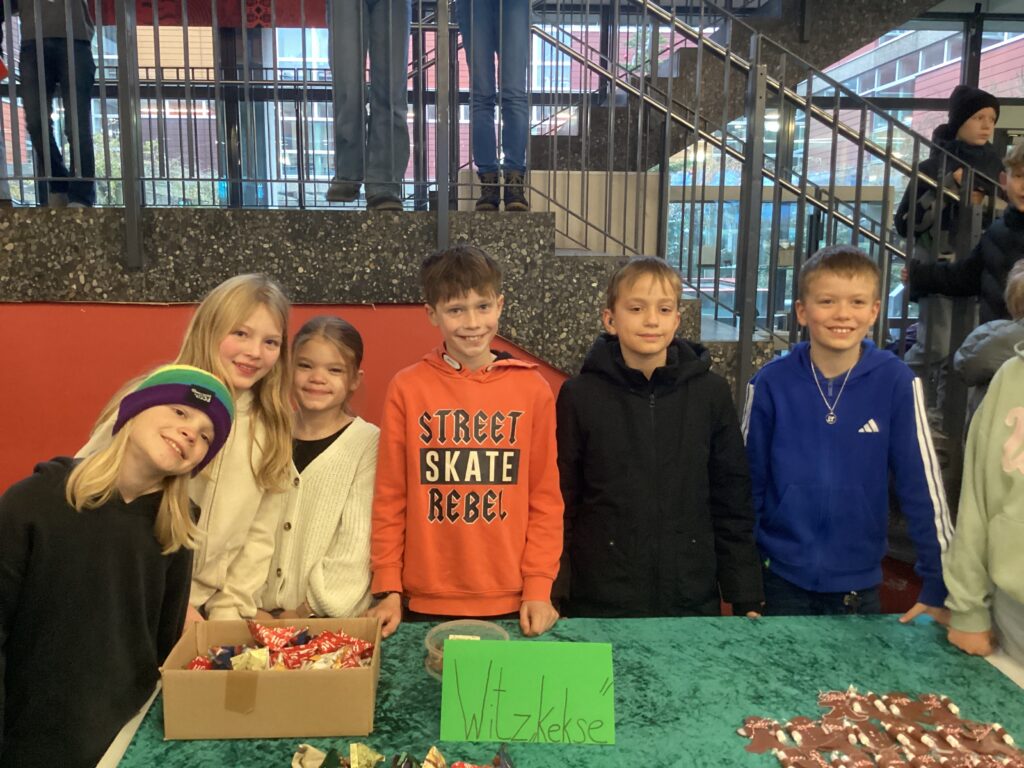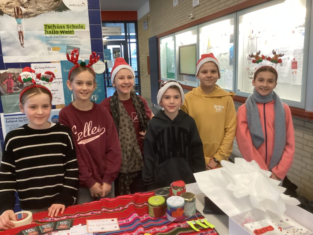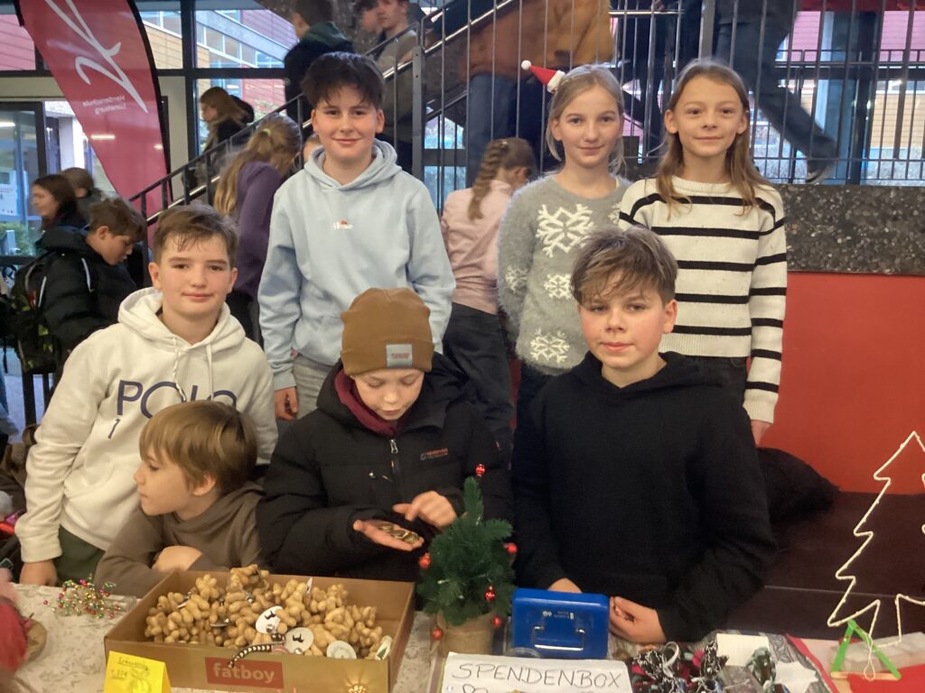Die Schülerinnen und Schüler aus dem Jahrgang 5 und 6 verkauften im Dezember Selbstgebasteltes, das im Religionsunterricht hergestellt worden war. Daneben gab es auch eine Tombola, Witz“kekse“ und als lustige Aktion das Armdrücken. Auch einige Spenden haben fleißige Sammler/innen gesammelt. Der Erlös ging an ein Spendenprojekt von Misereor für ein Projekt in Indien, das Kindern in Armut hilft. Dieses Mal war die Spende sehr hoch: 488,63 Euro. Großartig! Wir danken allen, die den Basar vorbereitet haben, und den Käufern und Käuferinnen.