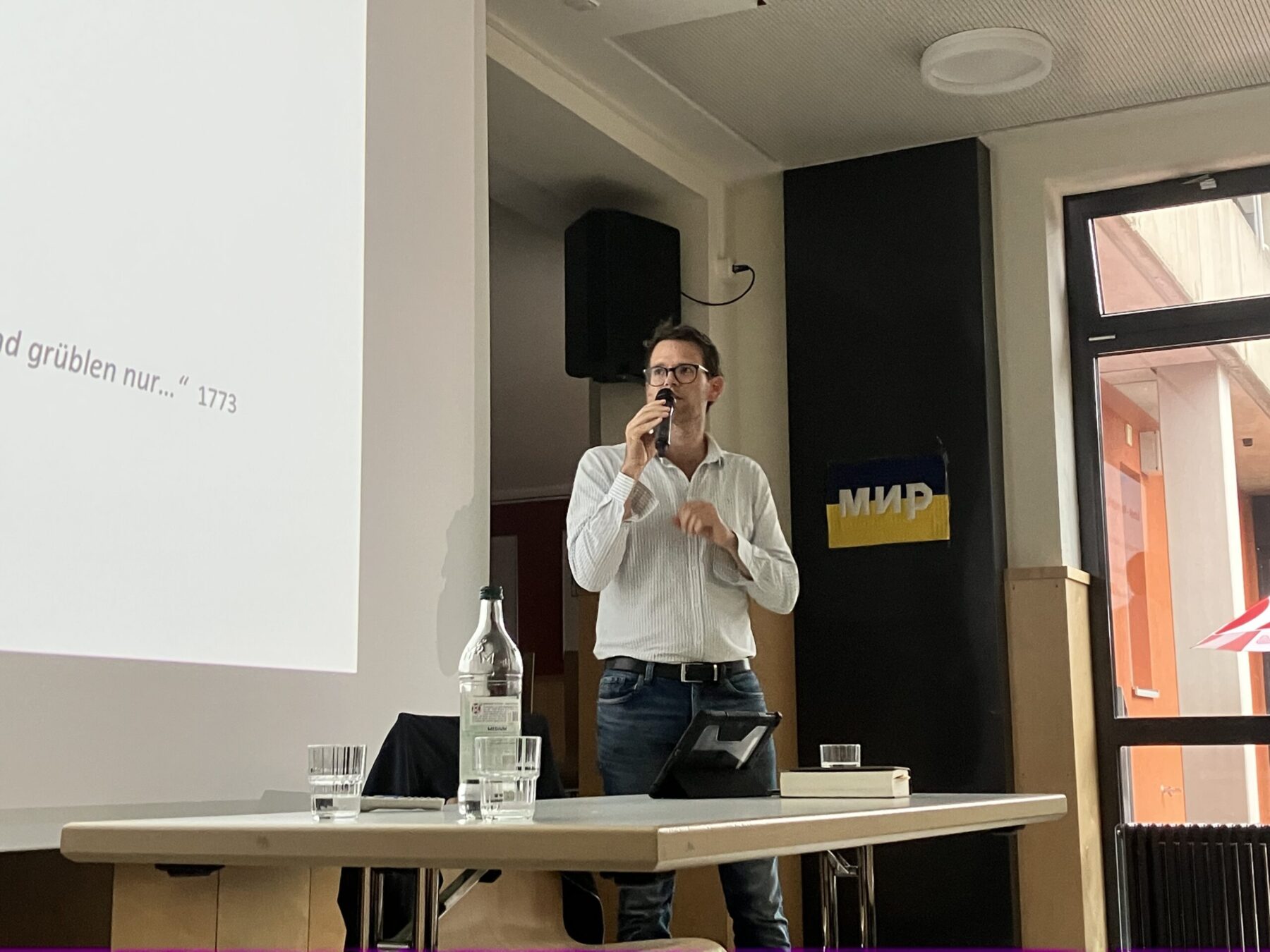 „Wer war eigentlich Johann Gottfried Herder?“ – mit dieser Frage startete Dr. Tim Kunze vom Ostpreußischen Landesmuseum am 18.9. in der Mensa der Herderschule seinen Vortrag. Er meinte selbst: Herder ist heute für viele eine Blackbox, kaum jemand kann auf Anhieb viel über ihn sagen. Doch was dann folgte, war ein kurzweiliger und kluger Streifzug durch Herders Leben und Denken: Wir erfuhren von einem Mann, der Sprache nicht nur als Werkzeug des Verstandes sah, sondern auch als Medium für Gefühle und als Brücke zwischen Menschen. Anders als Kant, der eher auf Vernunft und Rationalität setzte, betonte Herder Empfindsamkeit, Individualität und Toleranz – und das mit einer bemerkenswerten Bescheidenheit. Kein Wunder, dass er von sich selbst sagte: „Ein gutgesinnter Mensch wird sich viel mehr über das freuen, was er erweckte, als was er sagte.“ Am Ende ging niemand nach Hause ohne das Gefühl: Jetzt kennen wir Herder wirklich – und viel besser als vorher!