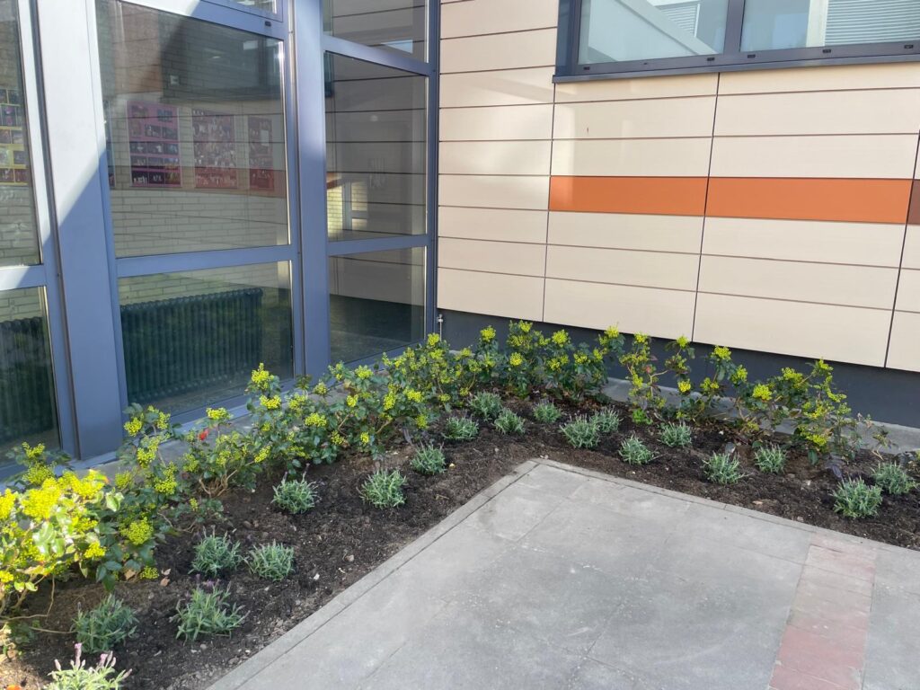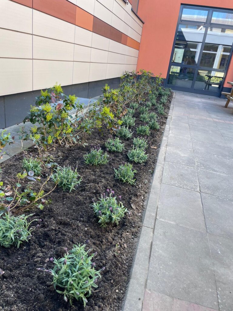Wir haben uns für Lavendel entschieden, weil er mit seinen lila Blüten gut in den Innenhof passt und zu den im Sommer blühenden anderen gelben Blumen im Innenhof einen schönen Akzent setzt. Gemeinsam haben wir das Beet mit neuer Erde vorbereitet und die Pflanzen eingesetzt.